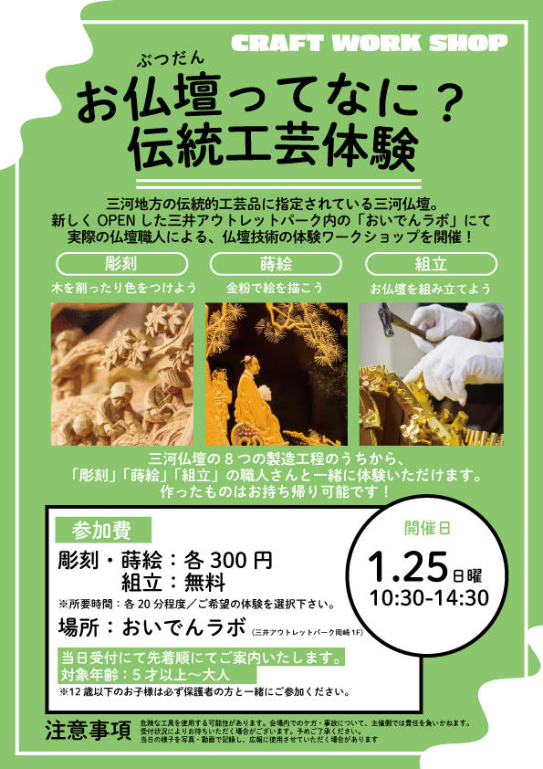 三河仏壇の職人さんによる、伝統工芸体験ワークショップを開催いたします。