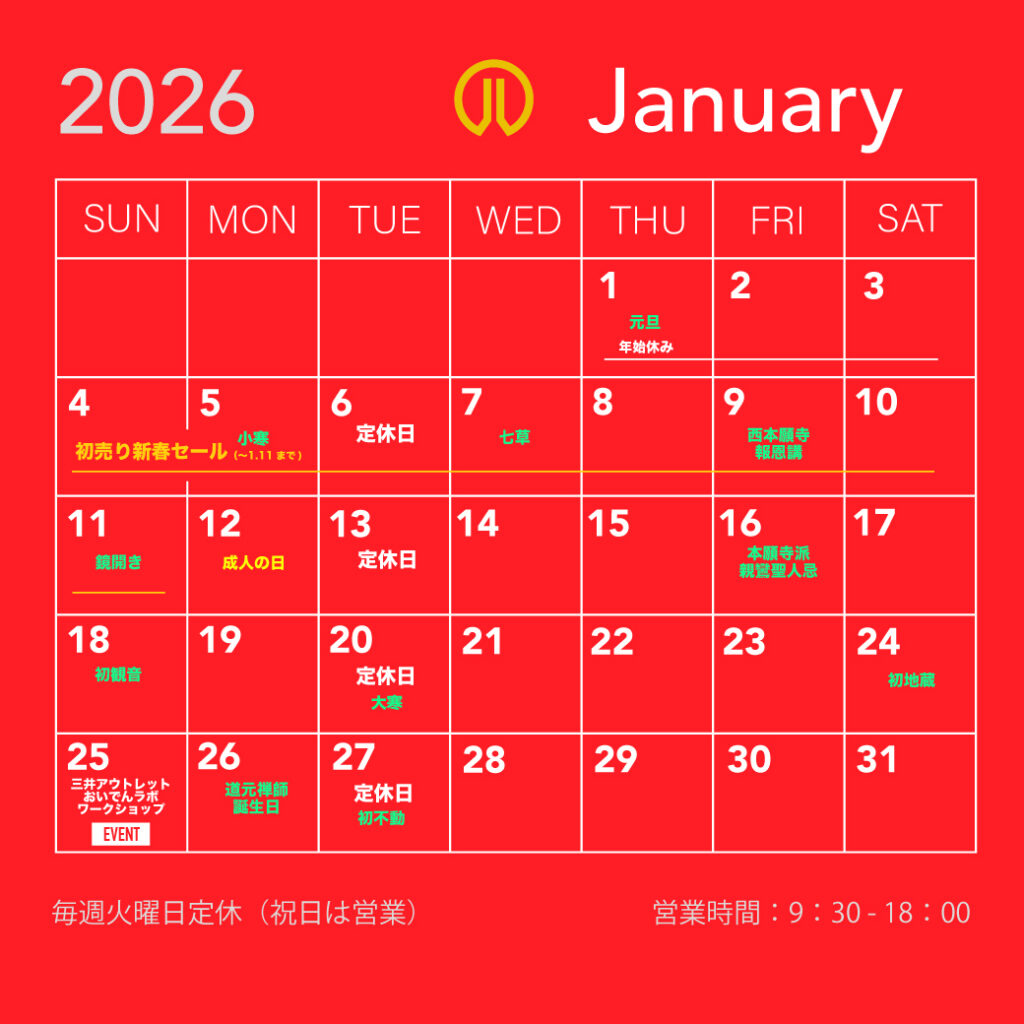 【愛知屋仏壇 2026年1月カレンダー】