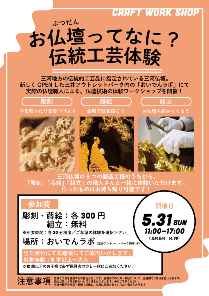 彫刻、蒔絵、組立という三河仏壇に施される伝統技術を体験いただけるワークショップです。
